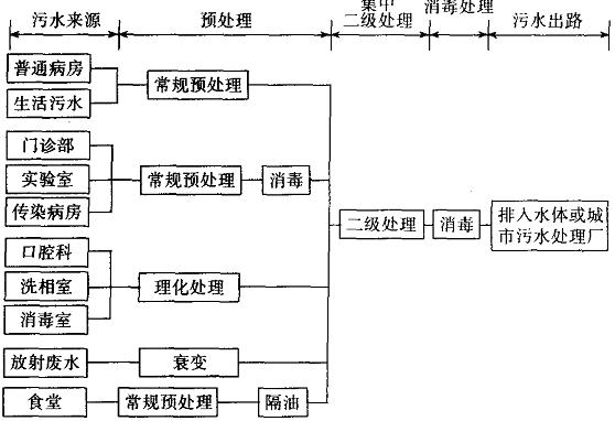 由于醫(yī)院有一些特殊工作條件,如化驗室、放射室、藥劑室等,所以會排放出特殊污水,如含有重金屬的污水、放射性污水、洗印污水和含油污水等。重金屬污水來自牙科治療和化驗,其中含有汞、鉻等有害物質(zhì),可用化學(xué)沉淀法或離子交換法處理;放射性污水來自同位素治療和診斷,可用衰變池處理;洗印污水來自照片洗印,含有銀、顯影劑、定影劑等有害物質(zhì),含銀廢水可電解回收銀,顯影劑和定影劑可用化學(xué)氧化法處理;含油污水來自廚房、食堂,應(yīng)首先采用隔油方法進(jìn)行預(yù)處理。