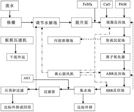 本項(xiàng)目采用水解酸化+混凝沉淀+離子氧化+ABR+SBR的組合處理工藝,工藝流程如下: