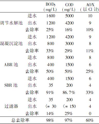 綜上分析,本項(xiàng)目采用水解酸化+混凝沉淀+離子氧化+ABR+SBR的組合處理工藝,其對環(huán)氧氯丙烷,二氯甲烷,AOX等有較好的去除效率,總的去除效率達(dá)60%以上。