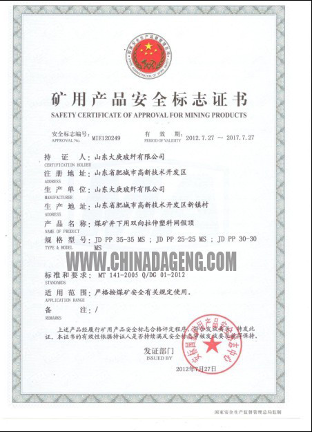 2012年,山東大庚玻纖有限公司為響應(yīng)國家安全生產(chǎn)的要求,遵守煤礦用設(shè)備、設(shè)施安全生產(chǎn)認證制度,保證為煤礦單位提供質(zhì)量可靠的支護材料(鋼塑復(fù)合假頂網(wǎng)、雙向拉伸塑料網(wǎng)假頂、聚酯纖維塑料網(wǎng)假頂?shù)染碌V用產(chǎn)品),確保煤礦作業(yè)安全。公司產(chǎn)品煤礦井下用雙向拉伸塑料護幫網(wǎng)、鋼塑復(fù)合假頂網(wǎng)、雙向拉伸塑料網(wǎng)假頂、聚酯纖維塑料網(wǎng)假頂?shù)染碌V用產(chǎn)品,經(jīng)過公司基本信息網(wǎng)上注冊申請、安標(biāo)中心初審受理、技術(shù)審查與產(chǎn)品檢驗、現(xiàn)場評審及終審等環(huán)節(jié),于2012年7月25日順利通過終審,并獲得安標(biāo)國家礦用產(chǎn)品安全標(biāo)志中心頒發(fā)的《礦用產(chǎn)品安全標(biāo)志證書》。