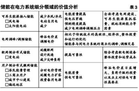 當(dāng)前,儲能在電力系統(tǒng)的細(xì)分領(lǐng)域應(yīng)用主要包括可再生能源接入儲能、電網(wǎng)調(diào)峰/調(diào)頻儲能、配電側(cè)分布式儲能和用戶側(cè)分布式微網(wǎng)儲能幾種,儲能在這些應(yīng)用中具有直接和間接經(jīng)濟(jì)價值。(見表3)