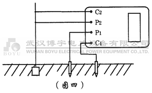 2、測(cè)量保護(hù)接地電阻時(shí),一定要斷開電氣設(shè)備與電源連接點(diǎn)。在測(cè)量小于1Ω的接地電阻時(shí),應(yīng)分別用專用導(dǎo)線連在接地體上,C2在外側(cè)P2在內(nèi)側(cè)如圖四所示: