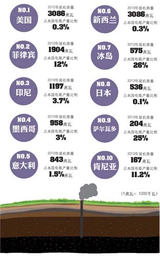本表格根據(jù)國際能源署2010年5月發(fā)布的《國際地?zé)崮苁袌鰣蟾妗泛蛧H地?zé)釁f(xié)會網(wǎng)站資料翻譯整理,中國名列第18位。