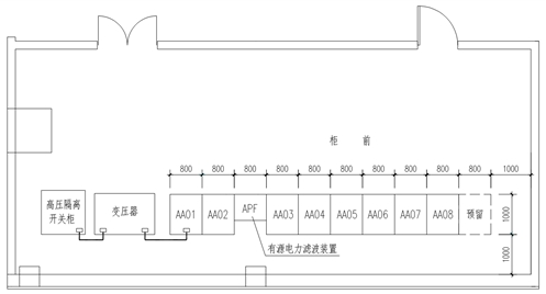 3)電氣設(shè)計人員在考慮系統(tǒng)接線及平面布置時應(yīng)注意將ANAPF的補償接入點盡量靠近補償對象,并處于采樣CT的上游,或在末端預留空間供設(shè)計安裝,CT采樣處下游不能包含容性負荷。平面布置示意如下圖: