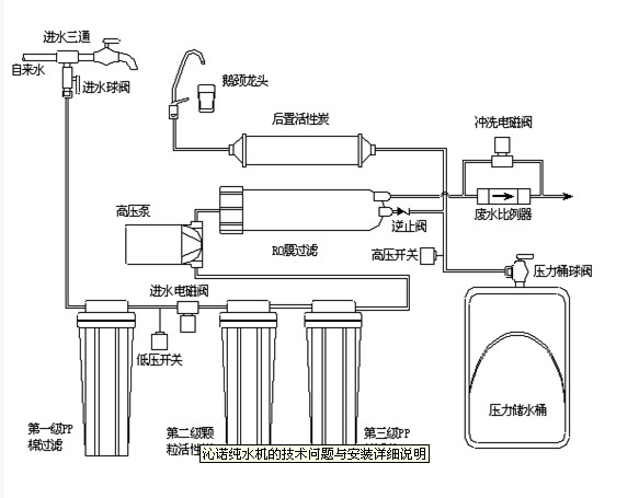 配件包配備5米長的管子,分別用于4處,分別為自來水進(jìn)水、壓力桶接管、鵝頸龍頭接管、濃縮水排出管,安裝人員一定要作到合理布局,便于檢修。