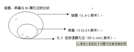 8、 RO膜:又叫逆滲透膜,它是依靠機(jī)器對原水所施加的壓力,使原水中水分子透過RO膜,而把原水中的細(xì)微雜質(zhì),過多的無機(jī)鹽、有機(jī)物、重金屬離子、細(xì)菌、病毒、農(nóng)藥、三氯甲烷廢物等其它有害物質(zhì)統(tǒng)統(tǒng)截留下來,并通過連續(xù)排放的濃水將這些水中有害異物及鹽分排出,進(jìn)而得到十分潔凈的飲用水。它的孔徑只有0.0001微米,它對水中粒徑最小的無機(jī)鹽…離子的去除率在90—96%以上,對細(xì)菌、病毒等有害異物的去除率在99.99%以上(理論上可以說成是100%)。