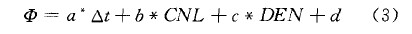 具體計算方法為:建立孔隙度( )與測井曲線值聲波時差△ 、中子CNL、密度DEN 的一個關(guān)系式如下(據(jù)中石化內(nèi)部文獻):