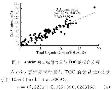 依據(jù)不同TOC含量,測得的吸附氣量,可以擬合本地區(qū)的吸附氣量與有機碳含量TOC的關(guān)系,進行類推。這里提供國外的吸附氣量與TOC關(guān)系(圖1),供參考。
