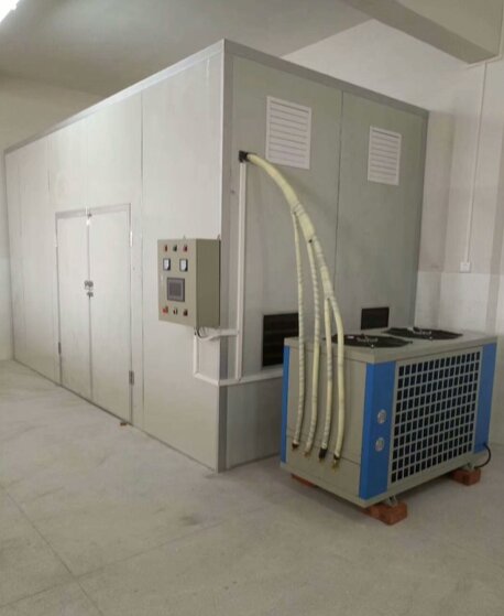 該烘干機主要是通過循環(huán)風機將熱泵產生的純凈熱風送入烘房內,使烘干機內的空氣循環(huán)流動,并在物料表面形成風力蒸發(fā),然后再由除濕裝置進行冷凝除濕,如此往復循環(huán)最后完成物料的干燥脫水。